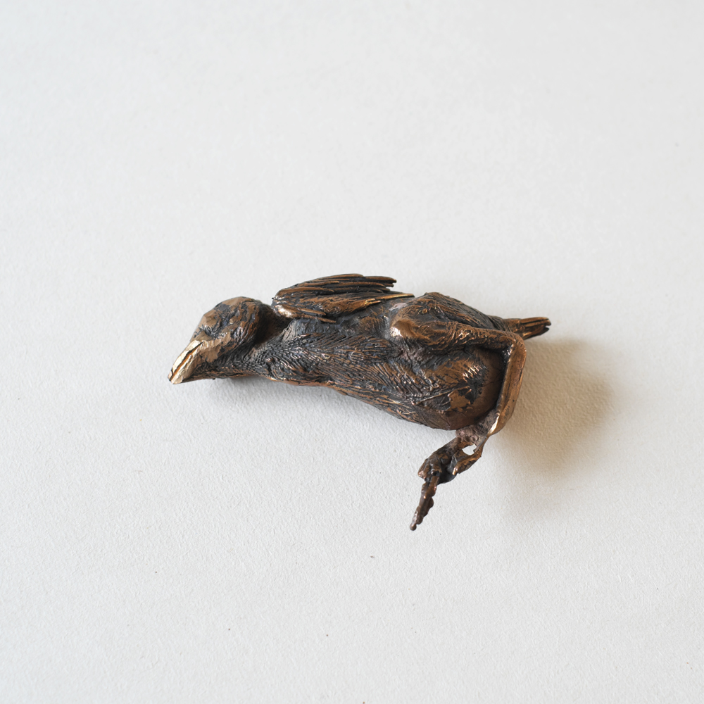 De serie ‘Rest in Bronze’, of R.I.B., is een knipoog naar ‘Rest in Peace’. Het moment van uiterste kwetsbaarheid — dat kleine, stille vergankelijke — wilde ik vereeuwigen in het onvergankelijke brons. Het ratje was het eerste beeldje in de serie. Toen ik de kwetsbaarheid van dit dode diertje zag, verdwenen alle negatieve associaties direct. Het beestje lag daar zo mooi, zo mild dood … vol overgave. Dat troostte mij; het deed me op een andere manier kijken.Ik noemde het ‘de schoonheid van de overgave’ De beelden die volgden, lieten andere thema’s toe: het ‘Tableau de chasse’, mijn heimwee naar Brugge maar vooral het vereeuwigen van het kwetsbare.